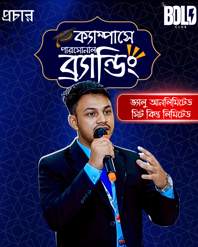 ক্যাম্পাসে আছো, কিন্তু কেউ তোমাকে চিনে না? তোমার ট্যালেন্ট, স্কিল আর স্টাইল—সবই আছে, তবু সুযোগগুলো যাচ্ছে অন্যদের ঝুলিতে? প্রতিদিন ক্লাস, এসাইনমেন্ট আর সোশ্যাল মিডিয়ার ভিড়ে হারিয়ে যাচ্ছো তুমি নিজেই। কে তুমি, কী চাও—এটাই ঠিক করে উঠতে পারছো না। এইভাবে চললে ক্যাম্পাস জীবন কেটে যাবে শুধুই ভিড়ে হারিয়ে যাওয়ার গল্প হয়ে… এইবার বদলাবে গল্প! Campus Personal Branding Webinar (Batch 2)-এ শিখে নাও কিভাবে ক্যাম্পাসেই নিজের পরিচিতি, সুযোগ আর প্রভাব তৈরি করা যায়।